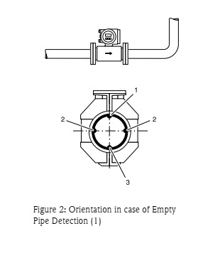 در صورت استفاده از عملکرد تشخیص لوله خالی (EPD) ، جهت گیری صحیح حسگر باید مد نظر قرار گیرد (شکل 2 را ببینید). الکترود تشخیص لوله خالی باید در بالاترین نقطه یک فلومتر الکترومغناطیسی نصب شده به صورت افقی قرار گیرد. اگر فلومتر باید در لوله ای افقی نصب شود، محفظه فرستنده/ترمینال باید بالای لوله قرار گیرد. در این حالت الکترود EPD در بالاترین نقطه لوله قرار می گیرد و به درستی عمل می کند. در کاربردهایی که احتمال نیمه پر بودن لوله کم است، جهت گیری الکترودها اهمیتی ندارد.