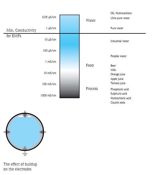 اگر هدایت الکتریکی سیال نسبتاً کم باشد، نمیتوان از فلومتر الکترومغناطیسی استفاده کرد. مایعات زیر به دلیل هدایت بسیار پایین قابل اندازهگیری نیستند: روغنهای گیاهی یا معدنی، آب دمینرالیزه، هیدروکربنها/حلالها و غیره (رجوع کنید به نمودارها). با این حال اگر این مایعات حتی با مقدار اندکی مایع رسانا مخلوط شوند، میتوان از فلومتر الکترومغناطیسی استفاده نمود. برای کاربرد موفق فلومتر، سیال باید حداقل هدایت زیر را داشته باشد: